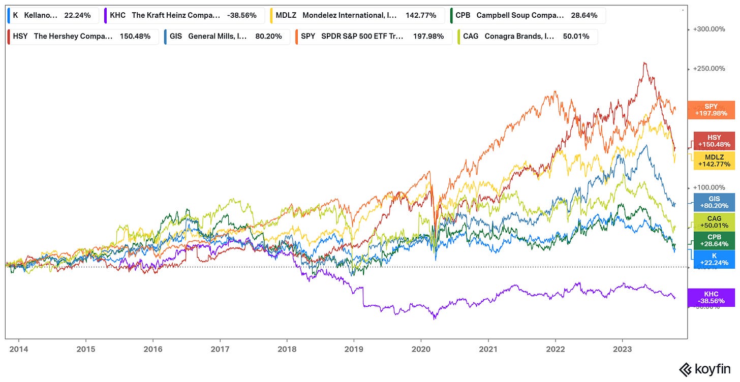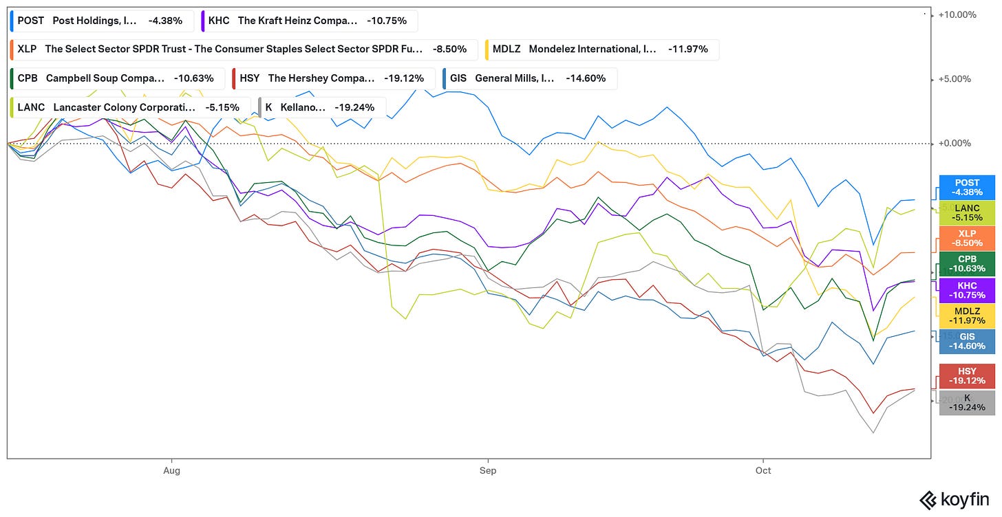 But there’s also a story to tell in which Ozempic is at best a minor contributor to the plunge in food manufacturers so far. There were very real valuation concerns at the top. KO looked overvalued and General Mills (a business with significant, structural, secular challenges in categories like cereal and yogurt) traded at 21x. Even the 19x multiple assigned Campbell looked ridiculous in the context of that company’s long-term track record and product lines.