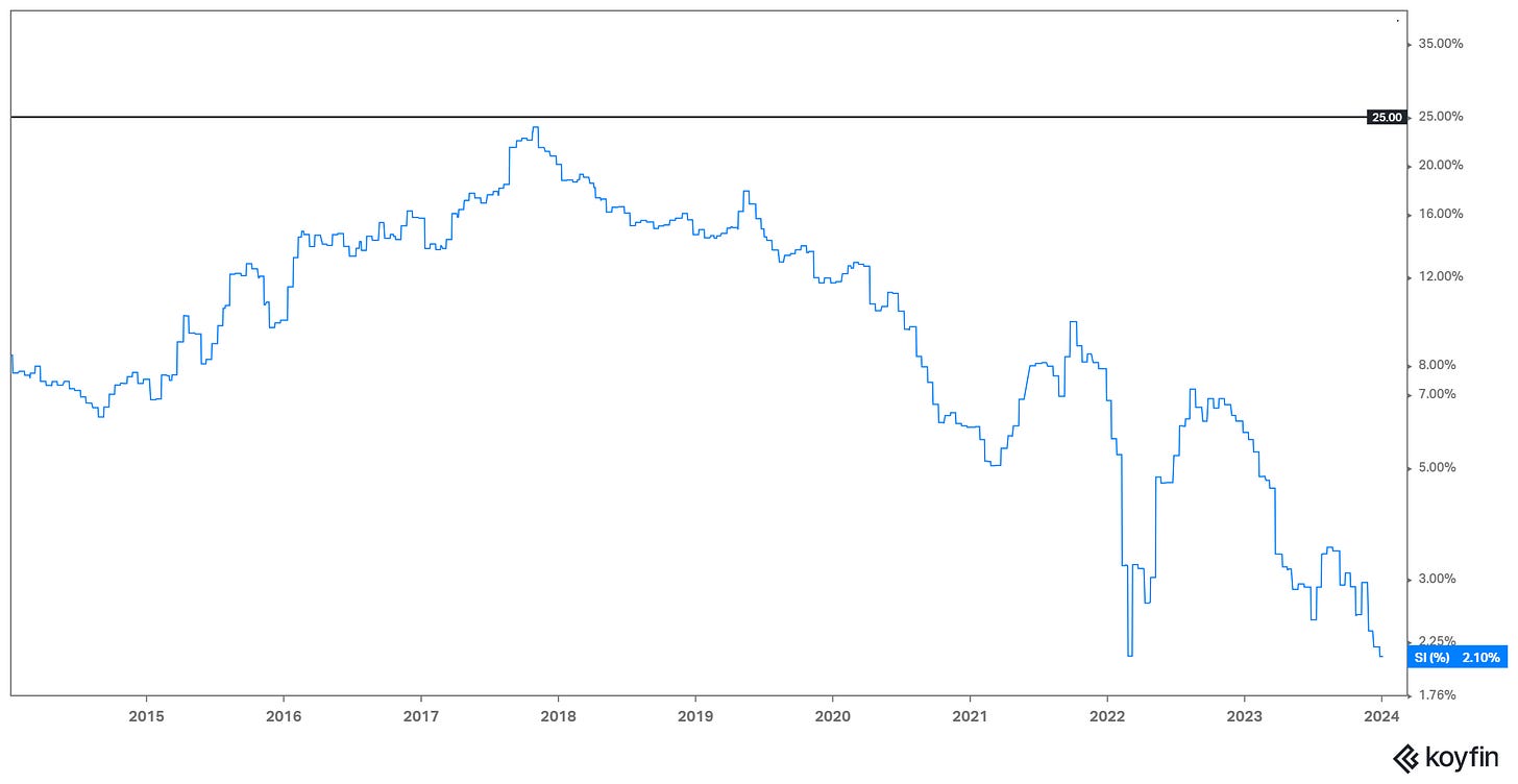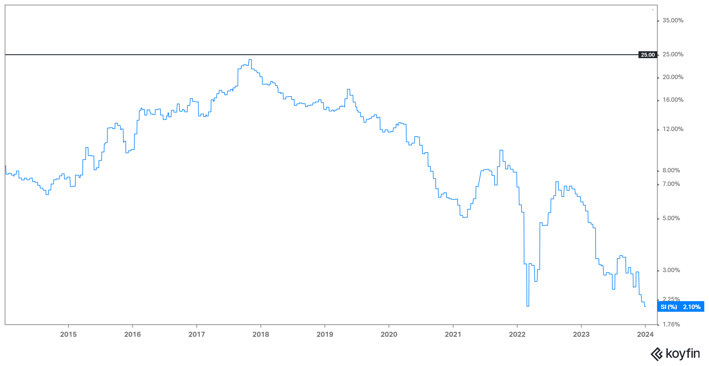 Overall, the market is showing a lot of patience. It’s possible that hard seltzer jumpstarts, or that Boston Beer gets back to reasonably consistent growth. But patience eventually runs out, and short sellers are always looking for an attractive target. Boston Beer needs to show a reason in 2024 for longs to enter, and shorts to keep staying away.