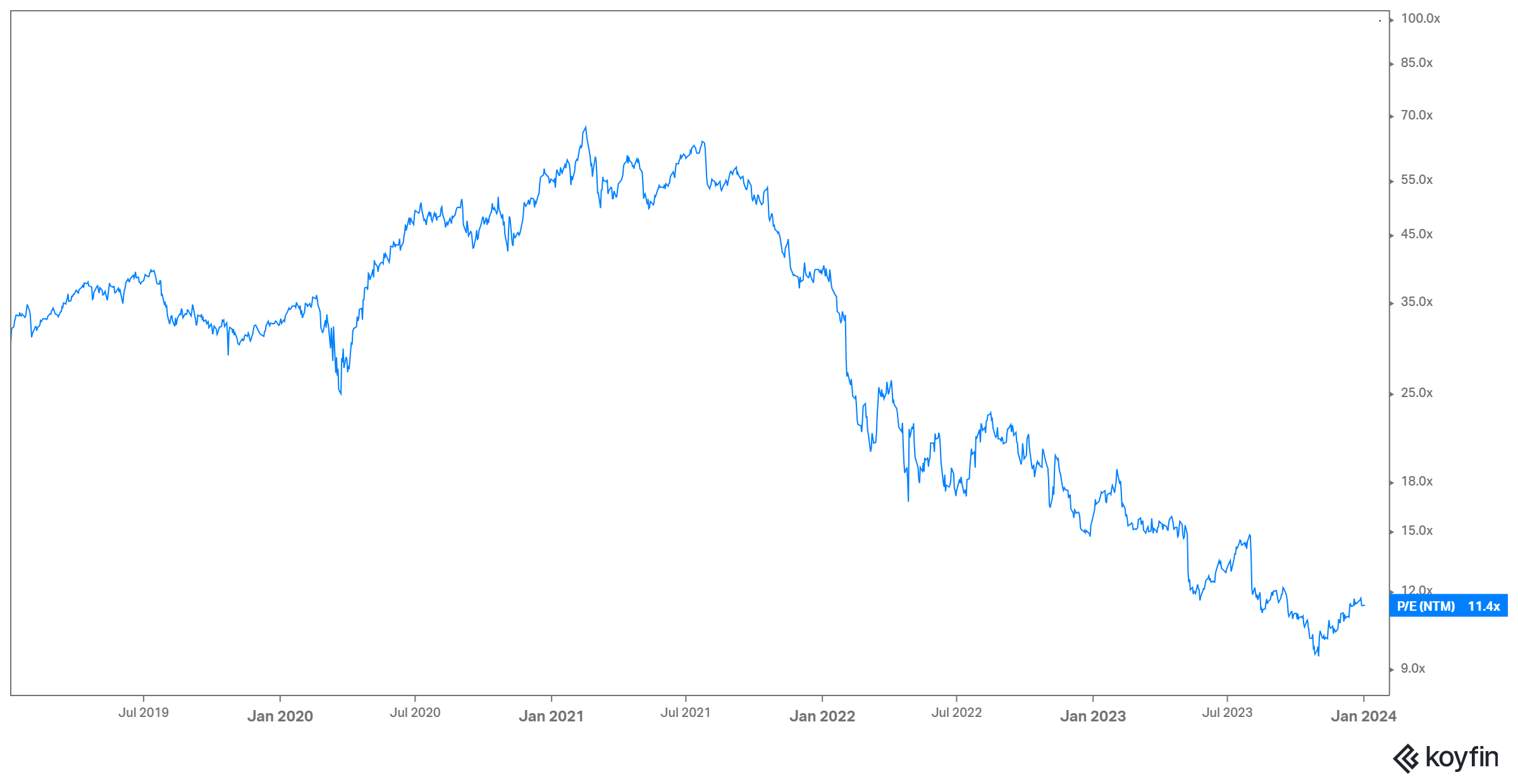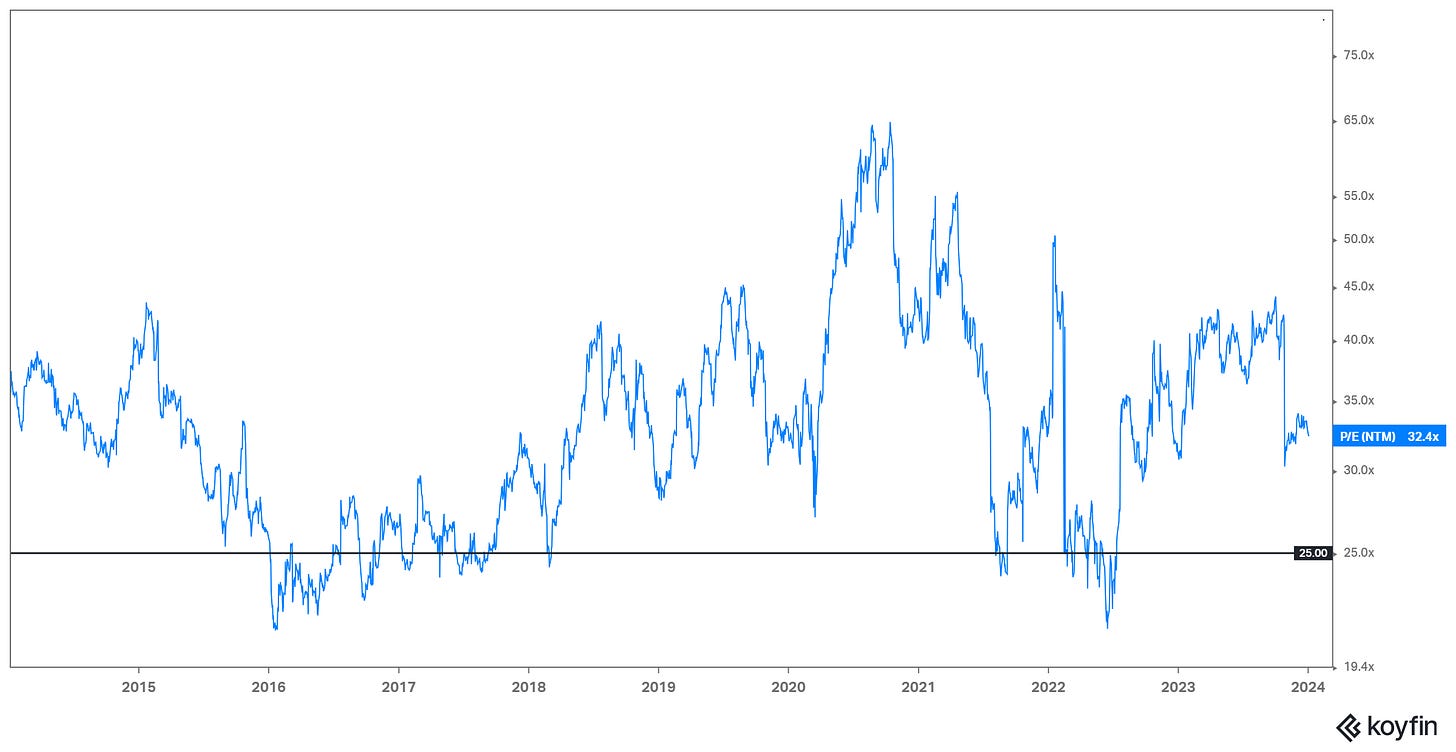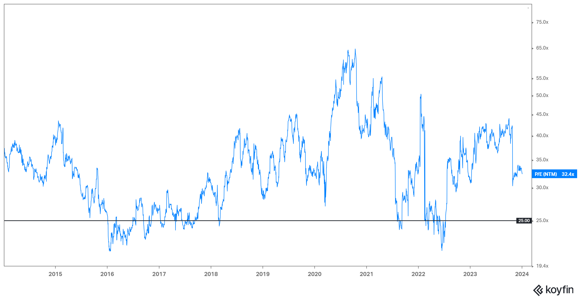 source: Koyfin; 10-year chart of forward price to earnings multiple