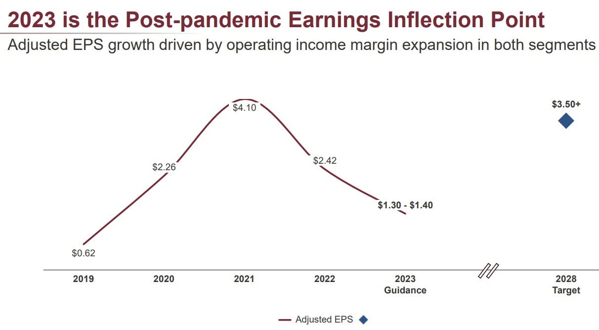 Taking the longer view, revenue has grown nicely on a multi-year basis: 2023 revenue should be more than 60% above the 2019 level. But it appears the bulk of that growth has come from hard seltzer, a category that seems unlikely to contribute much growth going forward. Meanwhile, consolidated gross profit has fallen, and advertising and promotion expense has grown at a faster rate than sales. As a result, guidance for this year’s adjusted EPS (still a range of $7.00-$9.00 post-Q3) is below the 2019 GAAP print of $9.16.