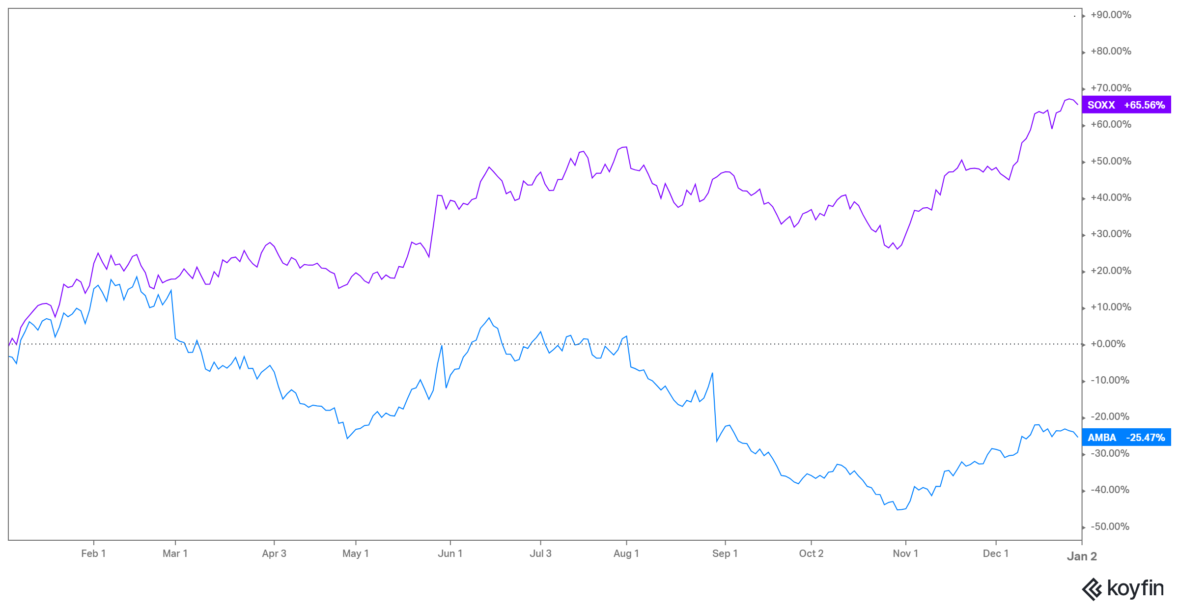 Those gains are completely gone. AMBA faded into the end of the year, and in fact finished the year down 25%. That’s remarkable underperformance against the sector as a whole. For the year, the Philadelphia Semiconductor Index gained 61%: