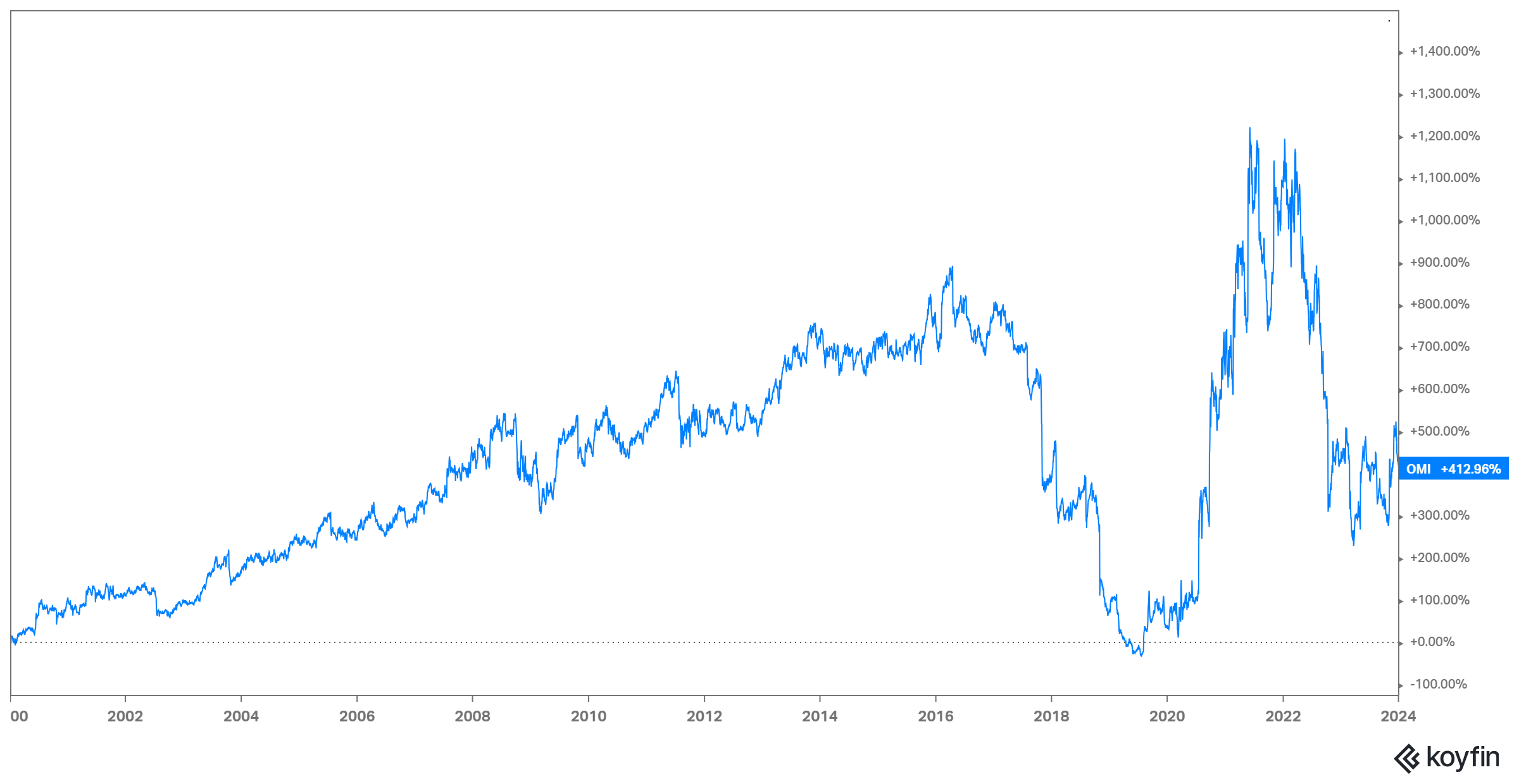 The sudden growth allowed O&M to pay down debt, and sharply lower its net debt-to-EBITDA ratio to under 2x. OMI stock unsurprisingly soared. At its June 2021 peak, the stock had rallied over 1,800% in less than two years, making it one of the best stocks in an exceptionally bullish market.