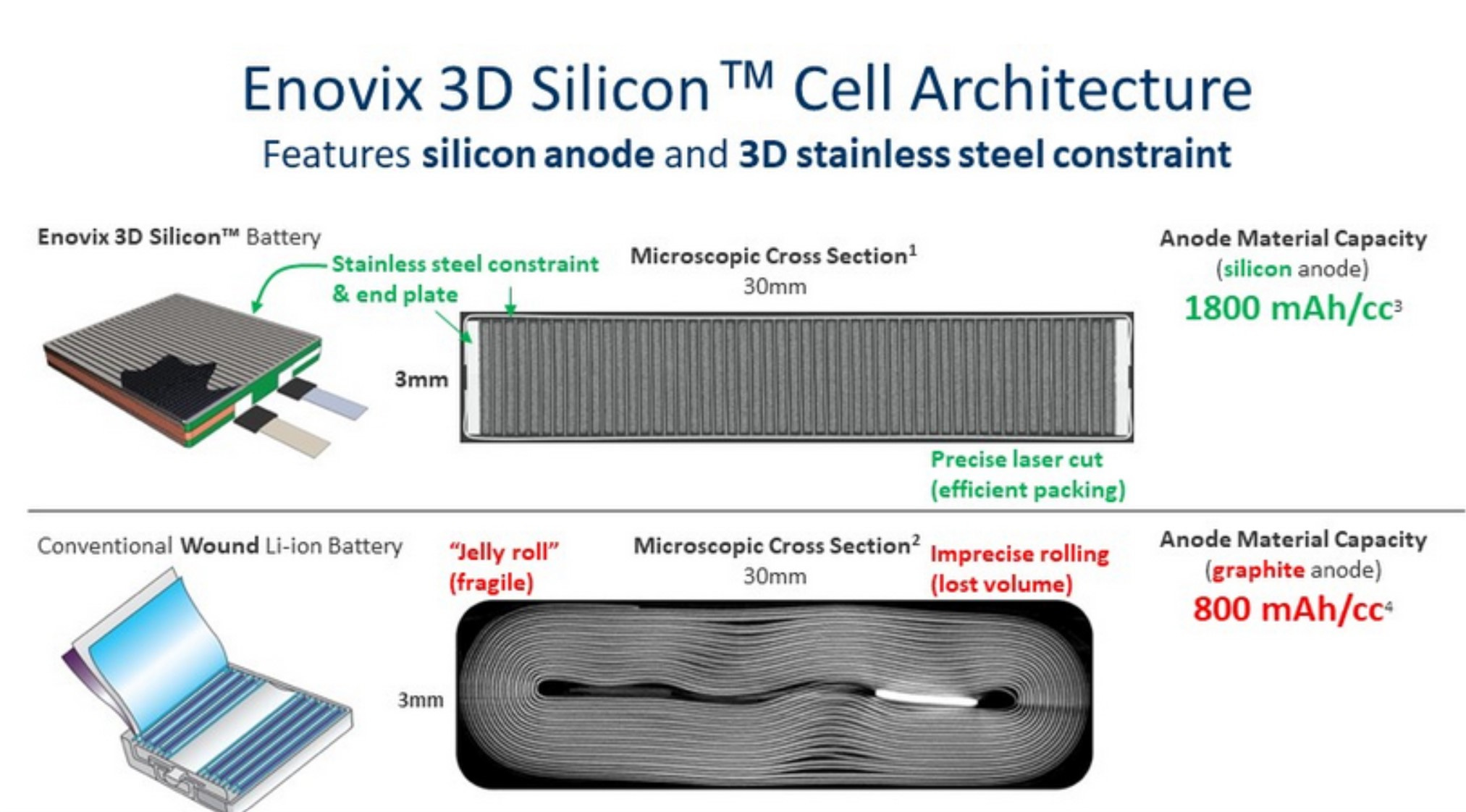 The difference is stunning. Silicon anodes in a “jelly roll” architecture would create force of as much as 3,400 pounds — again, enough to cause the battery to literally break apart. The Enovix design using the same silicon anodes, however, creates just ~210 pounds of force.