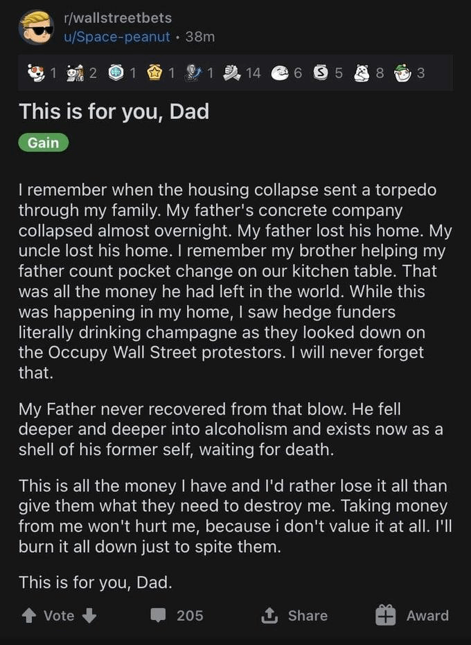 Those losses create the need to build a narrative for the sake of justification. In that narrative, buying GME at $350 pre-split wasn’t a foolish attempt to chase a bubble as it was ready to pop. No, not at all. It was an act of rebellion. It was a shot at the establishment that had taken away so much, from someone who cares about money so little that they ran to their trading account when an opportunity to make that money seemed to arise. (And they would have gotten away with it, too, it wasn’t for those pesky Robinhood restrictions.)