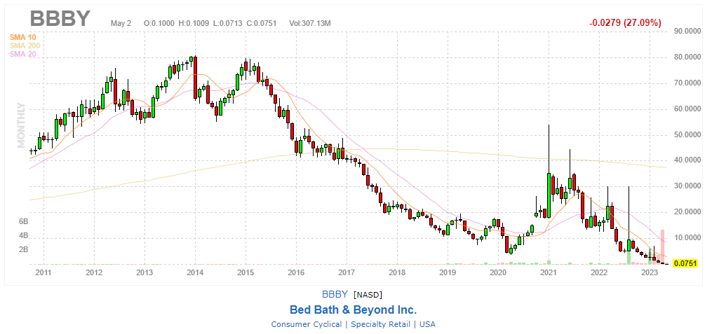 As far as I can tell, BBBY (or BBBYQ, as it will be called, given the bankruptcy filing last week) is the first ‘meme stock’ in which shareholders will know they have lost the entirety of their investment.