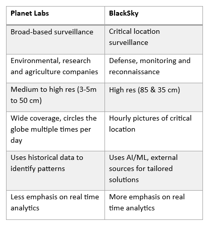For example, Planet Labs and BlackSky both use constellations of small satellites but they have subtle differences as seen in the table below: