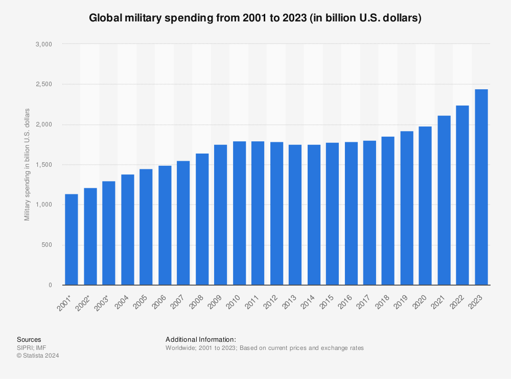 Secular tailwinds in space and defense spending. Investment in space presents a long-term secular tailwind while defense spending is rising globally in the wake of the Ukraine war. 2024 saw the largest annual rise in government spending on defense in over a decade (see chart further down).