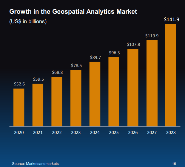 The market is also growing. According to Markets and Markets, an independent research firm, the global geospatial analytics market is projected to grow from about $79 billion in 2023 to about $142 billion by 2028, resulting in a compound annual growth rate of 12.6%. It’s a huge market and there is space for more than one player. That said, the industry is still in flux. Mergers, acquisitions and failures are to be expected going forward.