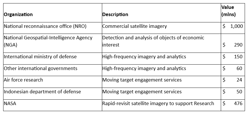 US federal government & other US agencies – They have contracts with multiple US defense, intelligence and other agencies (government and civilian). Two examples - National reconnaissance office (NRO) and National Geospatial-Intelligence agency (NGA), They also have Department of Defense customers like air force.