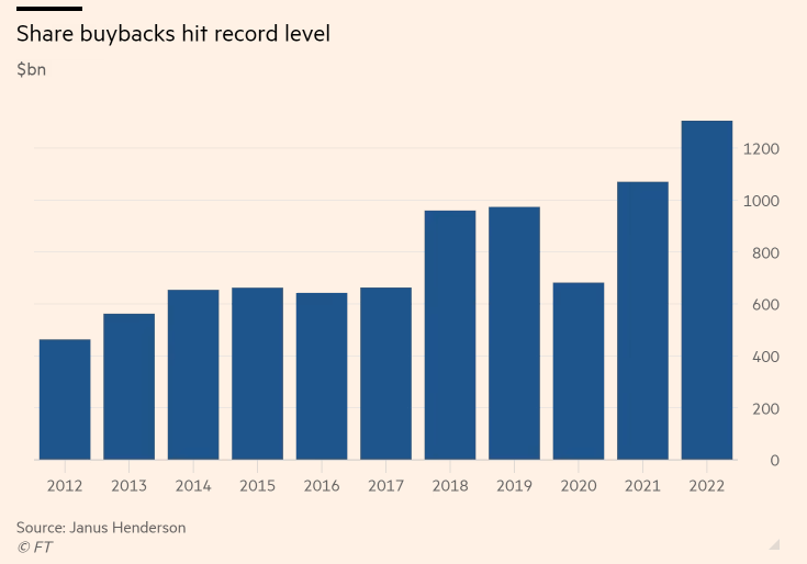 Last week, the Financial Times published an article entitled “Record buyback spree attracts shareholder complaints.” It’s an impressive piece in that it marshals so many of the erroneous arguments against buybacks in one place — and sources those arguments from fund managers around the world. The article notes that, in 2022, the world’s 1,200 biggest public companies repurchased $1.3 trillion in stock — “almost as much as they paid out in dividends.”