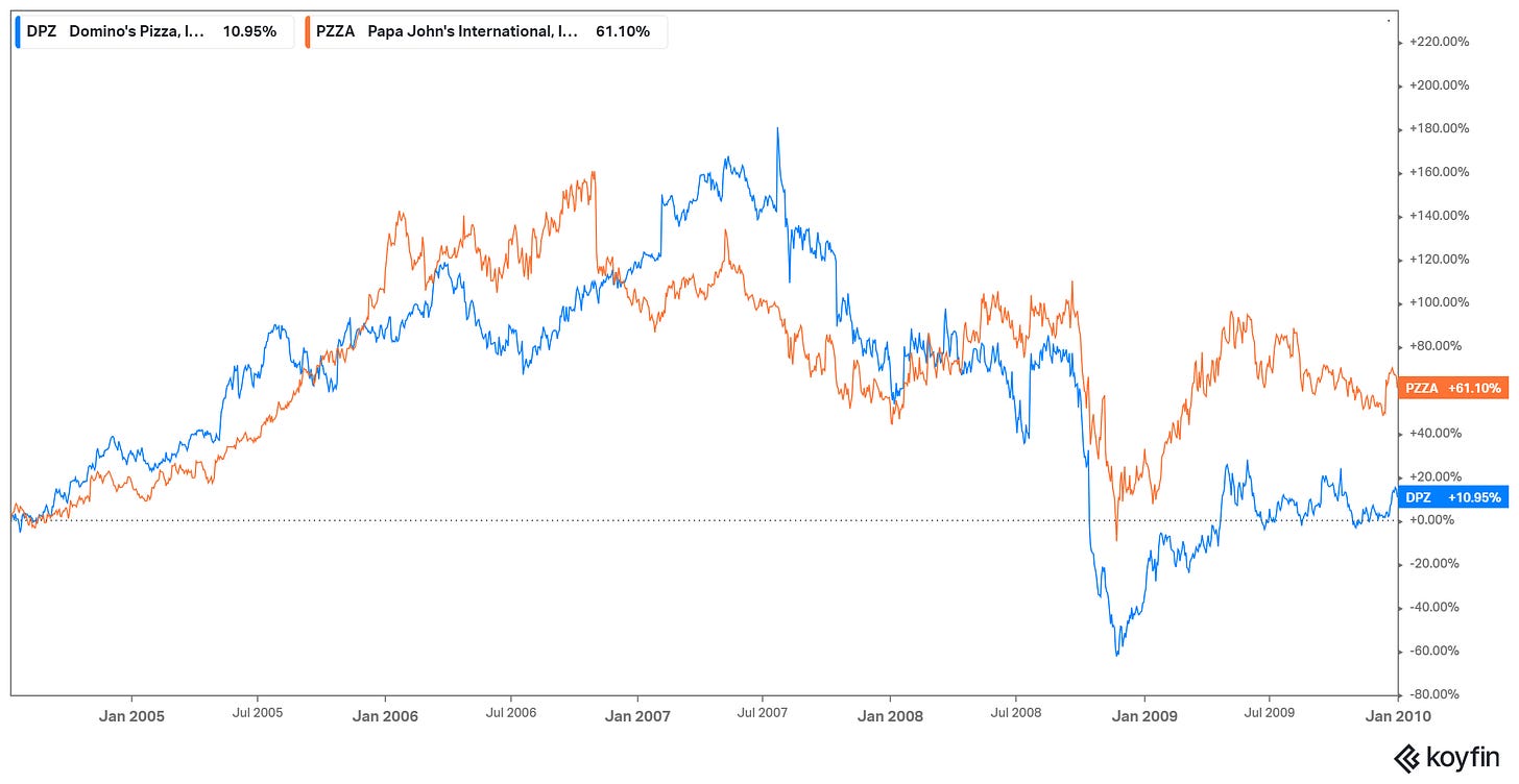 Unsurprisingly, DPZ stock tanked. And while the financial crisis played a role, the comparison to competitor Papa John’s PZZA 0.00%↑ suggested that Domino’s itself was to blame as well: