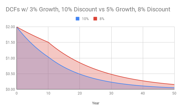 Imagine a business with free cash flow per share of $2.00, which is projected to grow 5% annually, where the discount rate is 8%. A rough DCF model (which assumes 2% growth in perpetuity after 10 years) values each share at $42.84.