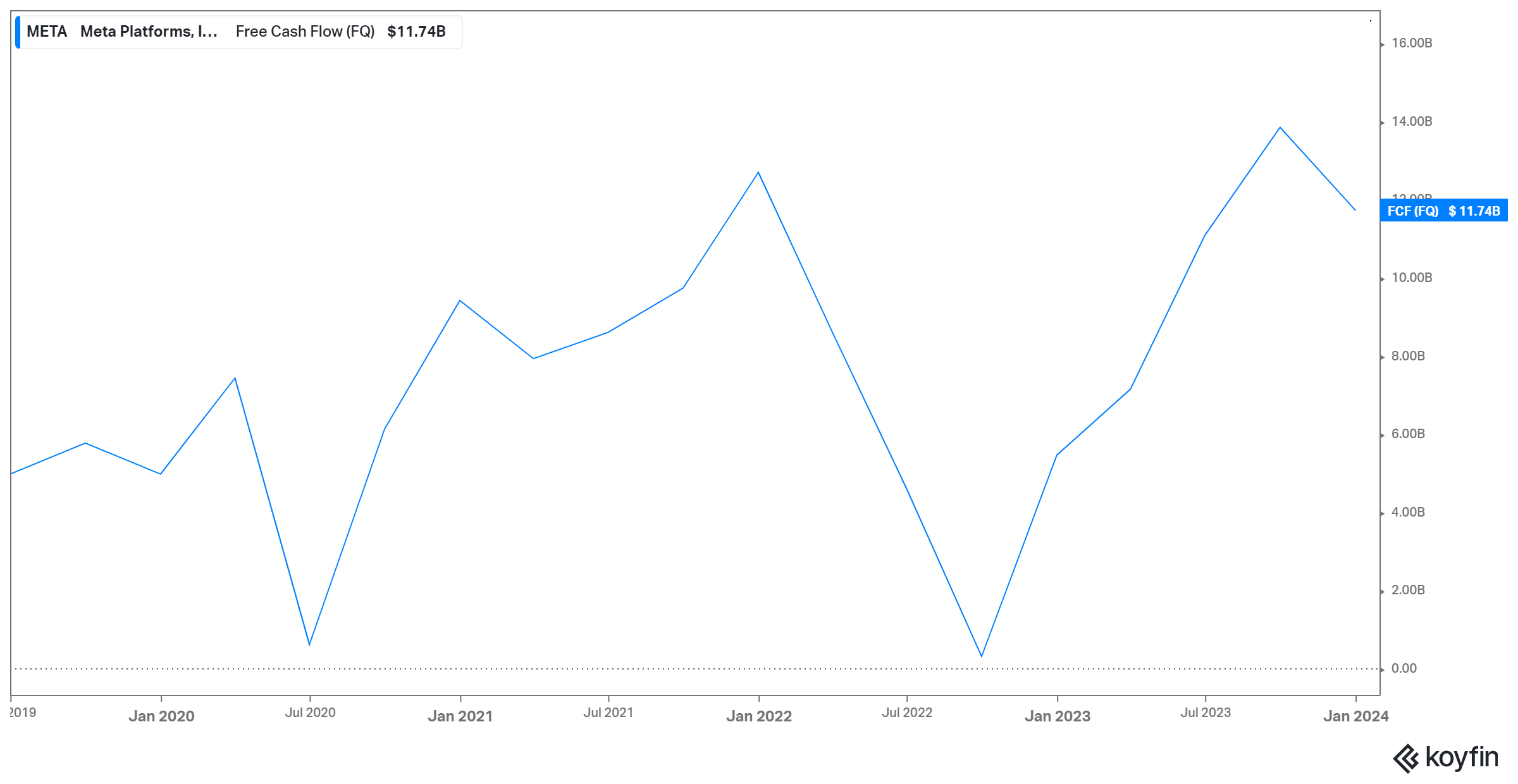 Above is a five-year chart of quarterly free cash flow from Facebook owner Meta Platforms $META. The chart is hardly unusual.