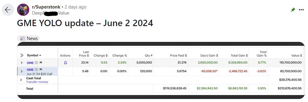 On Monday morning, GME opened up 74%. Shares have faded from those highs, but the stock has still moved, with two-day gains of 14.5%. That’s enough for Gill’s position — as represented in the Reddit post — to gain about $48 million in value1.