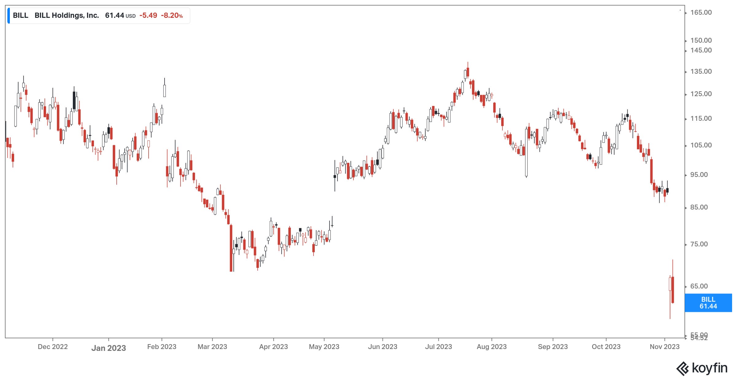 In this earnings season, we have a perfect example of this phenomenon. On Thursday, after the market closed, bill payment provider Bill Holdings BILL 0.00%↑ reported earnings for the third quarter. Relative to consensus expectations, Bill.com had a solid quarter: adjusted EPS of 54 cents was 4 cents better than the Street anticipated, and revenue growth was about two percentage points higher than sell-side analysts expected.