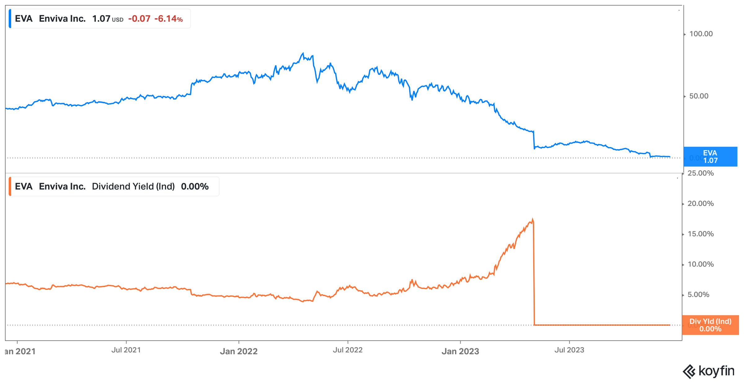 Our first piece in this series, on Walgreens Boots Alliance WBA 0.00%↑, too highlighted the danger of chasing yield. Enviva EVA 0.00%↑, which we covered in June, had just eliminated its dividend; the stock plunged 67% in a single session and has fallen another 85% since.