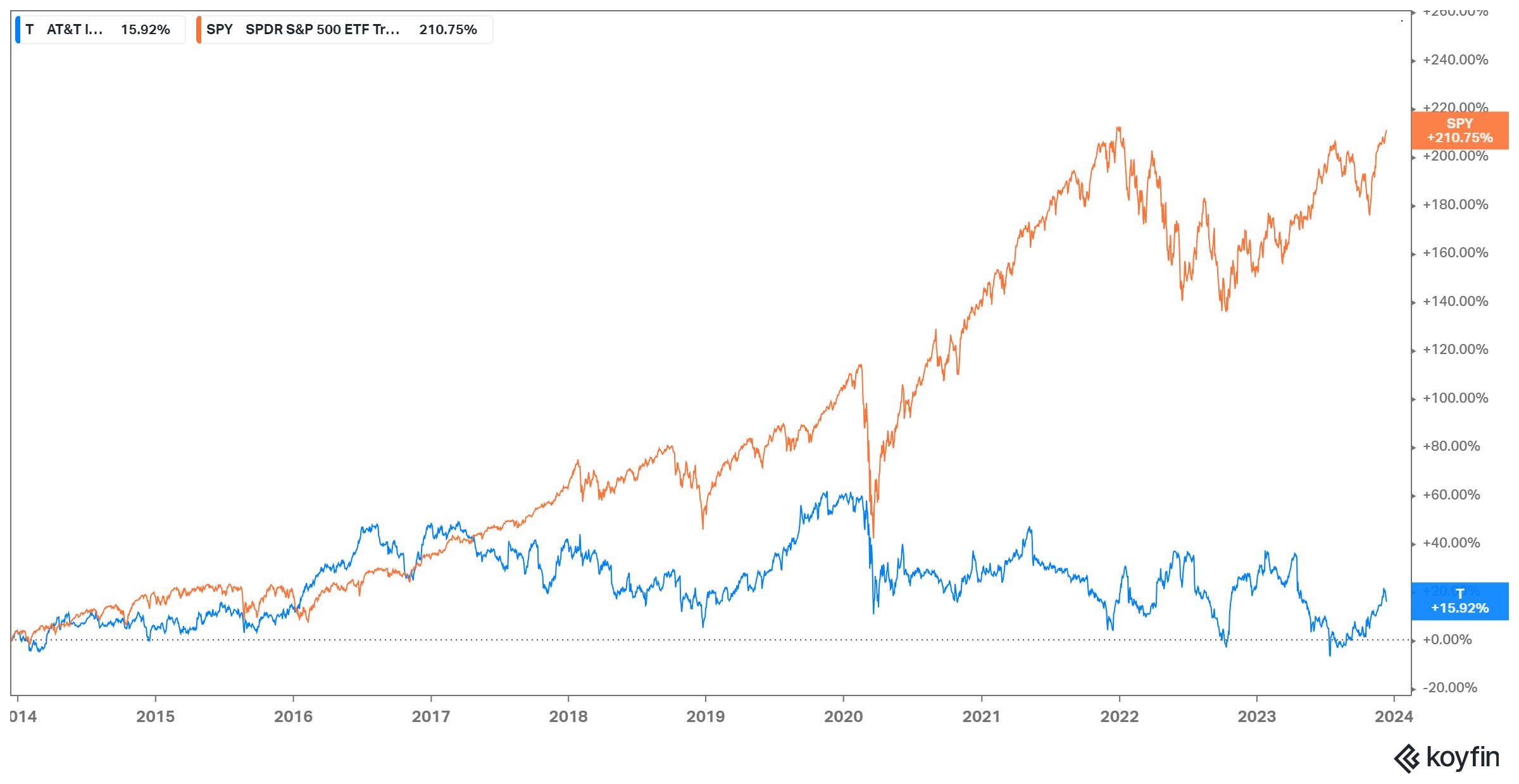 As a result, investors have been chasing yield in T for years and have been punished with startling underperformance: