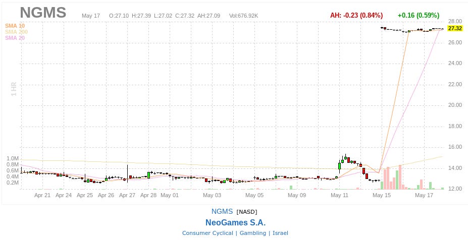 Our second article ever, a long pitch for iGaming play NeoGames NGMS 0.00%↑, is now our best-performing idea so far. On Sunday, the company disclosed that it was being acquired by Australia’s Aristocrat Leisure for a $29.50/share all-cash offer. The stock closed Wednesday at $27.32, up 106% from where we recommended it.