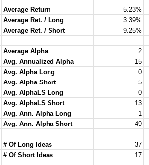 That said, it’s been our short ideas that have carried most of the water. Long performance is basically flat to the S&P, and we’ve unfortunately stumbled into a few value traps. Our shorts, however, have been excellent. Average alpha of five percentage points, 13 points against the inverse of the S&P 500, and 49 points on an annualized basis.
