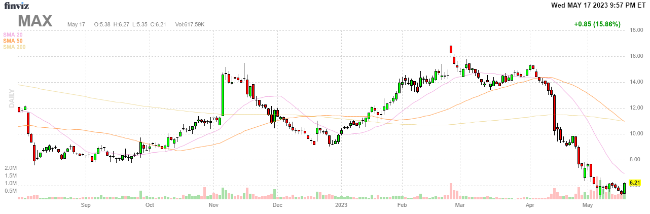 In April, we argued that shorts could likely cover, and for two days the stock found a bottom. MAX promptly dropped 40% once again, this time in just eight trading sessions, and again with absolutely no news from the company itself: