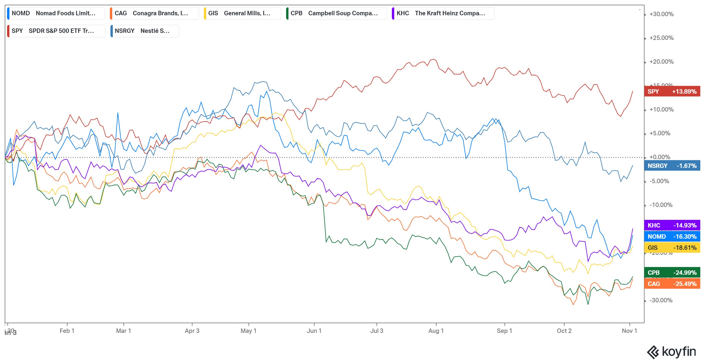 Broadly speaking, one of the reasons for the reversal in U.S. food manufacturers has been investor attitudes toward pricing. In 2022, those manufacturers took significant price — often above 10% — but volumes held up regardless. In 2023, the story has been different: consumers clearly are feeling the pressure, and trading down from branded and/or high-priced products.