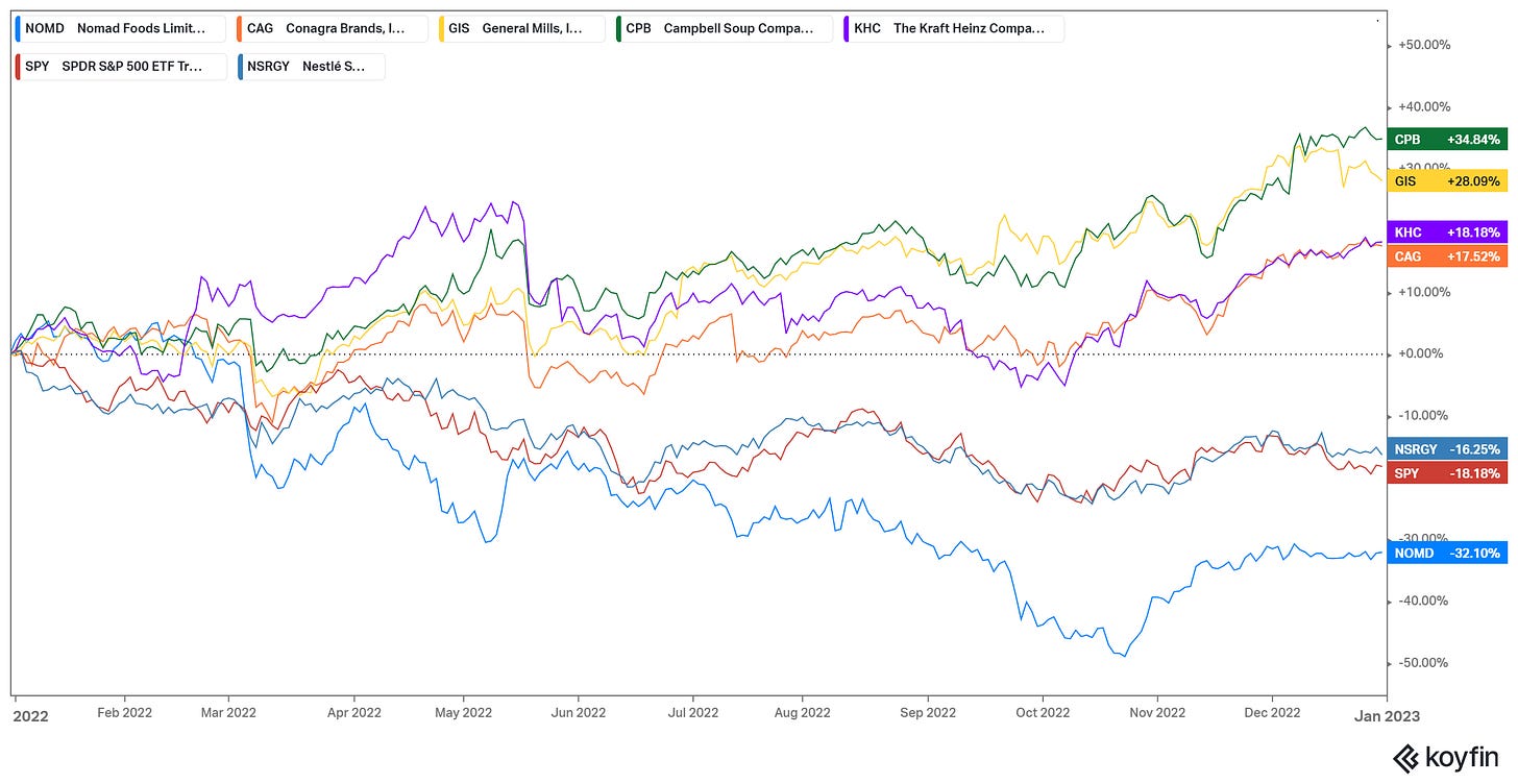 When we recommended U.K. frozen food manufacturer Nomad Foods NOMD 0.00%↑, we noted the underperformance of the stock against U.S. peers during 2022. U.S. food manufacturers posted huge gains last year, but European names were left behind: