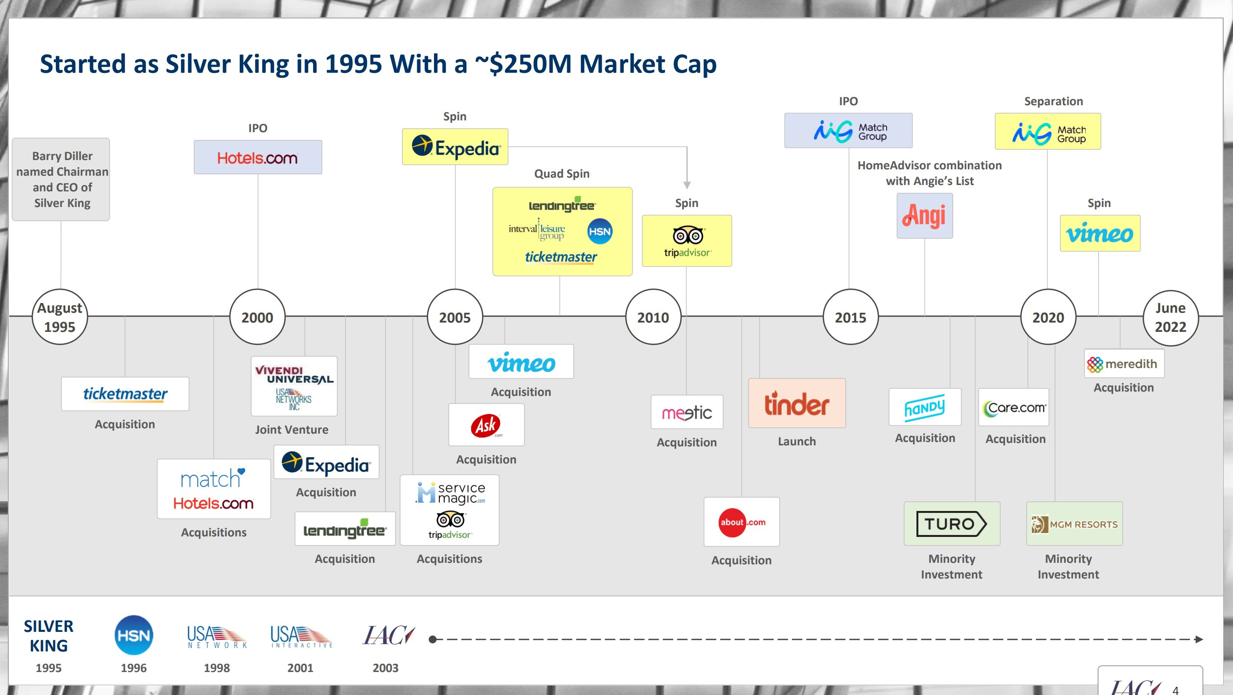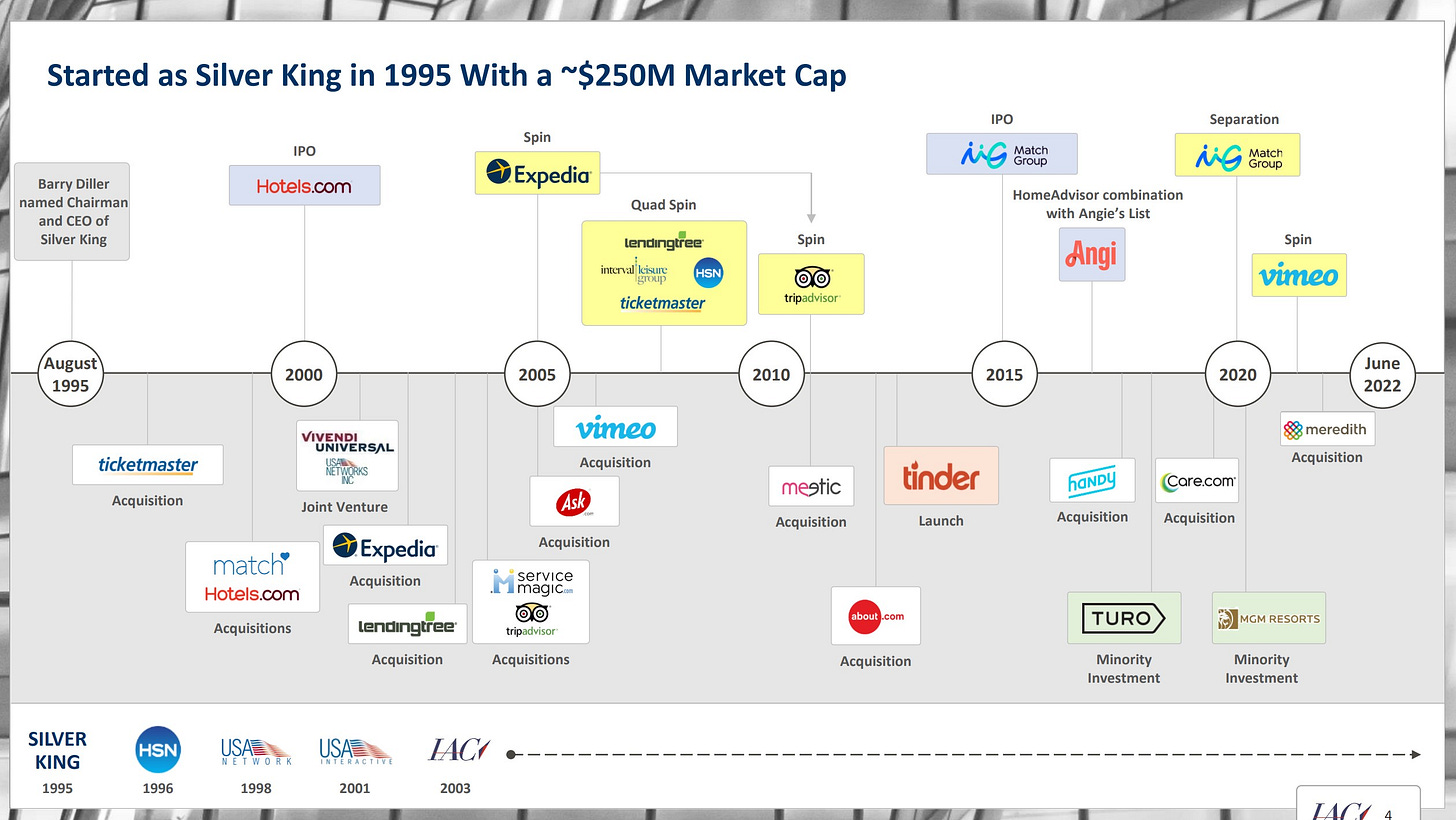 IAC/InterActive Corp. IAC 0.00%↑ is probably the purest SOTP play out there at the moment. Since its founding in 1995, IAC has bought, built, and spun a large number of well-known digital businesses: