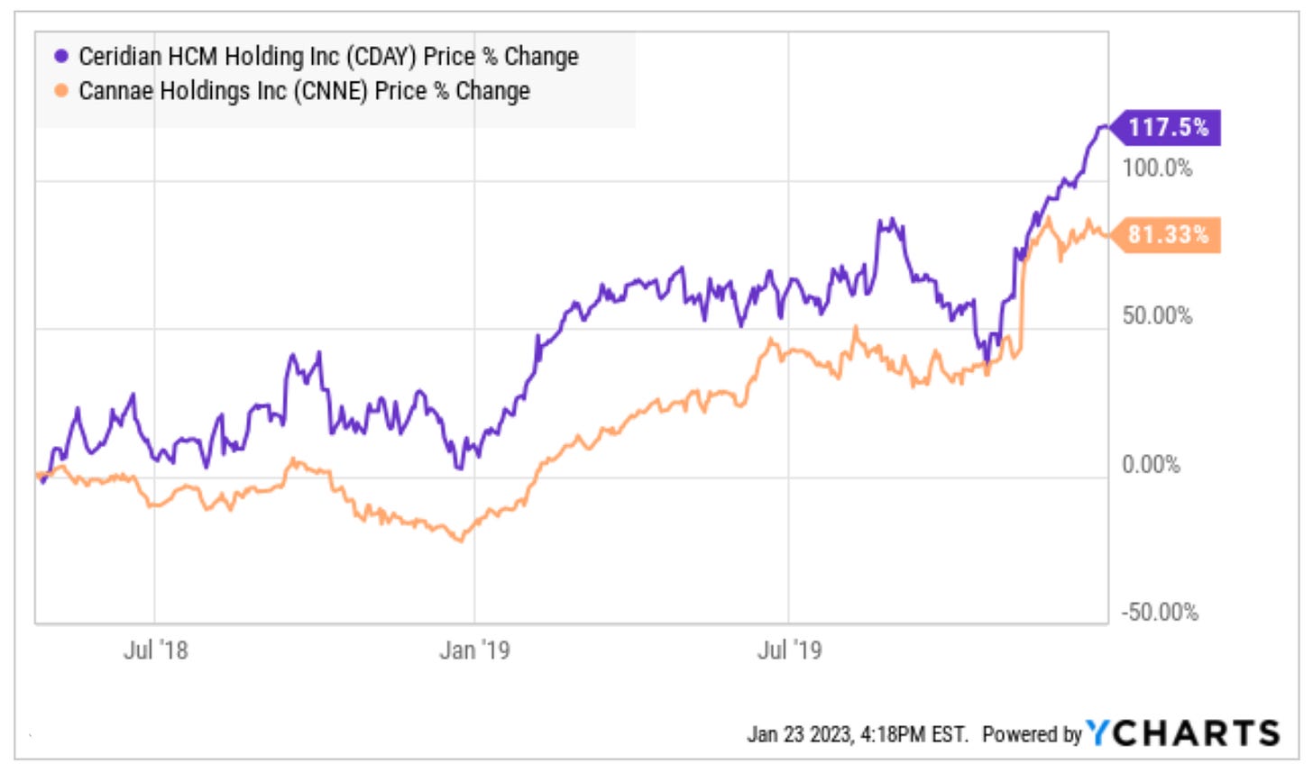 Cannae was split off from Fidelity National Financial FNF 0.00%↑ as a tracking stock in 2014, and became fully independent three years later. At the time, Cannae's most valuable asset was a stake in software developer Ceridian CDAY 0.00%↑. Ceridian went public in 2018, and like so many other software stocks at that time performed exceptionally well. CNNE went along for the ride: