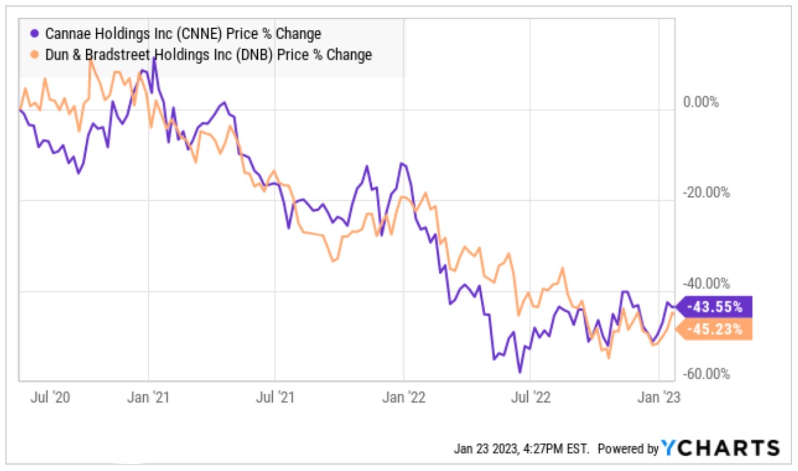But a now-leveraged DNB has tanked in a more nervous market. Just as CDAY brought CNNE up, DNB has done the opposite: