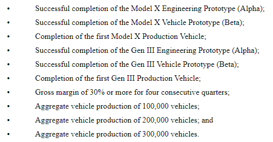 In 2012, Tesla gave Musk his first package. It seemed huge at the time. Musk received options to buy 5% of Tesla at the stock price at the time the package was awarded ($31.17 per share, or $2.08 adjusted for subsequent stock splits). But for all of those options to vest, Tesla had to reach ten operational milestones, and had to hit ten successive levels of market capitalization. At the highest end, Musk’s package would be worth roughly $2 billion — but it would require Tesla’s market cap to rise by more than 13x3 and for the business to take the following steps: