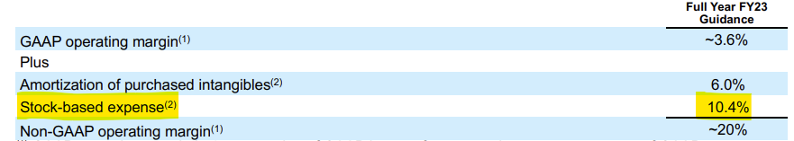 For fiscal 2023, Salesforce in March 2022 was guiding for $32 billion in revenue, and still was more than doubling its adjusted operating margin by excluding stock-based compensation. Investors were happily paying more than 40x that adjusted figure — and ~80x adding back stock-based comp — for the stock. Many of those investors pointed to 20% margins as proof of how impressive the underlying business was.