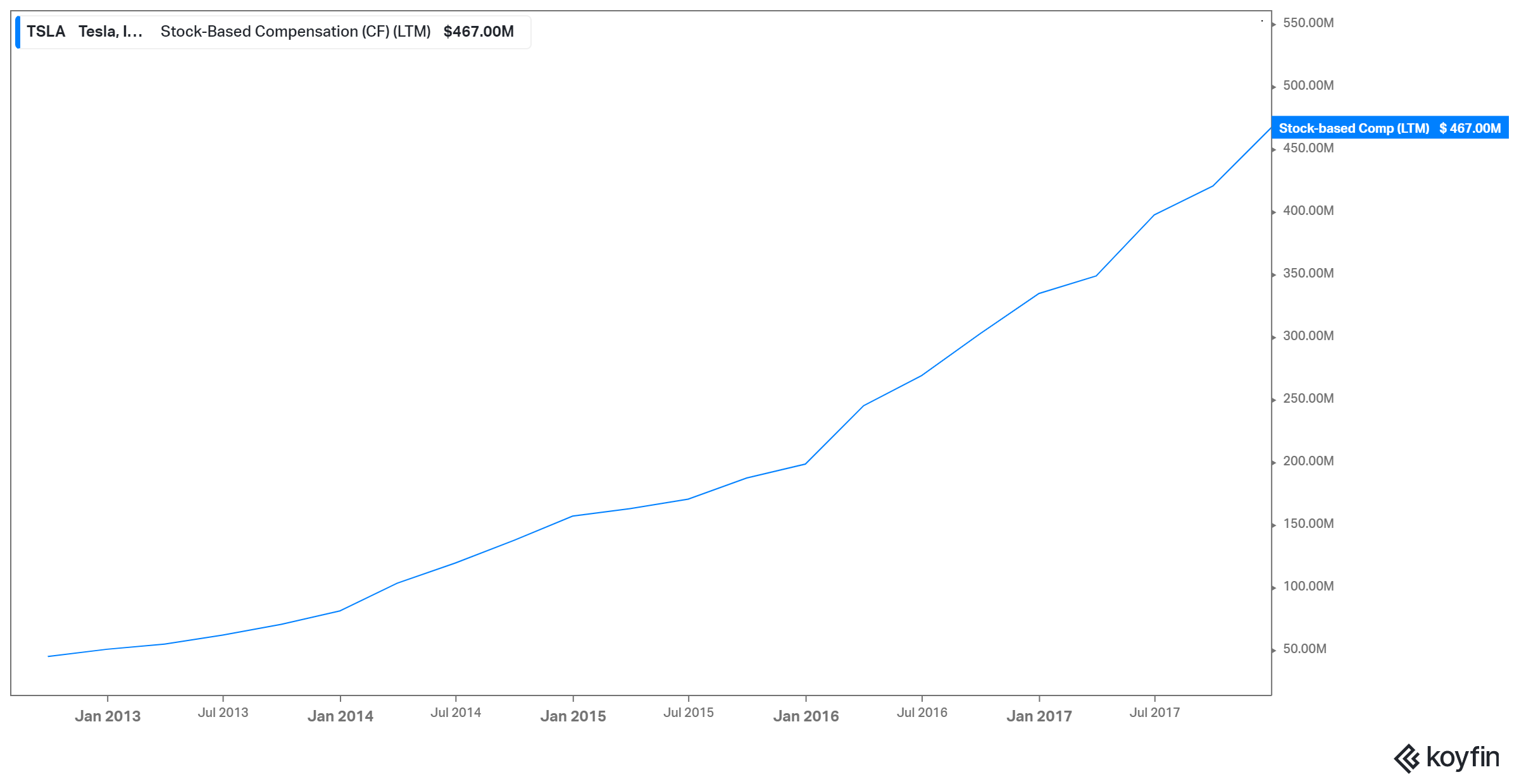Or she could read the 10-K (p. 84), see the $910 million of expense related to the Musk award, and simply add his options to the share count to account for the fact that all of the options would vest. She could then use the remaining ~$1.2 billion to roughly estimate dilution going forward (book expense/market cap is a reasonable proxy, though the K usually gives enough detail to get more specific), and build that rise in share count into her model.