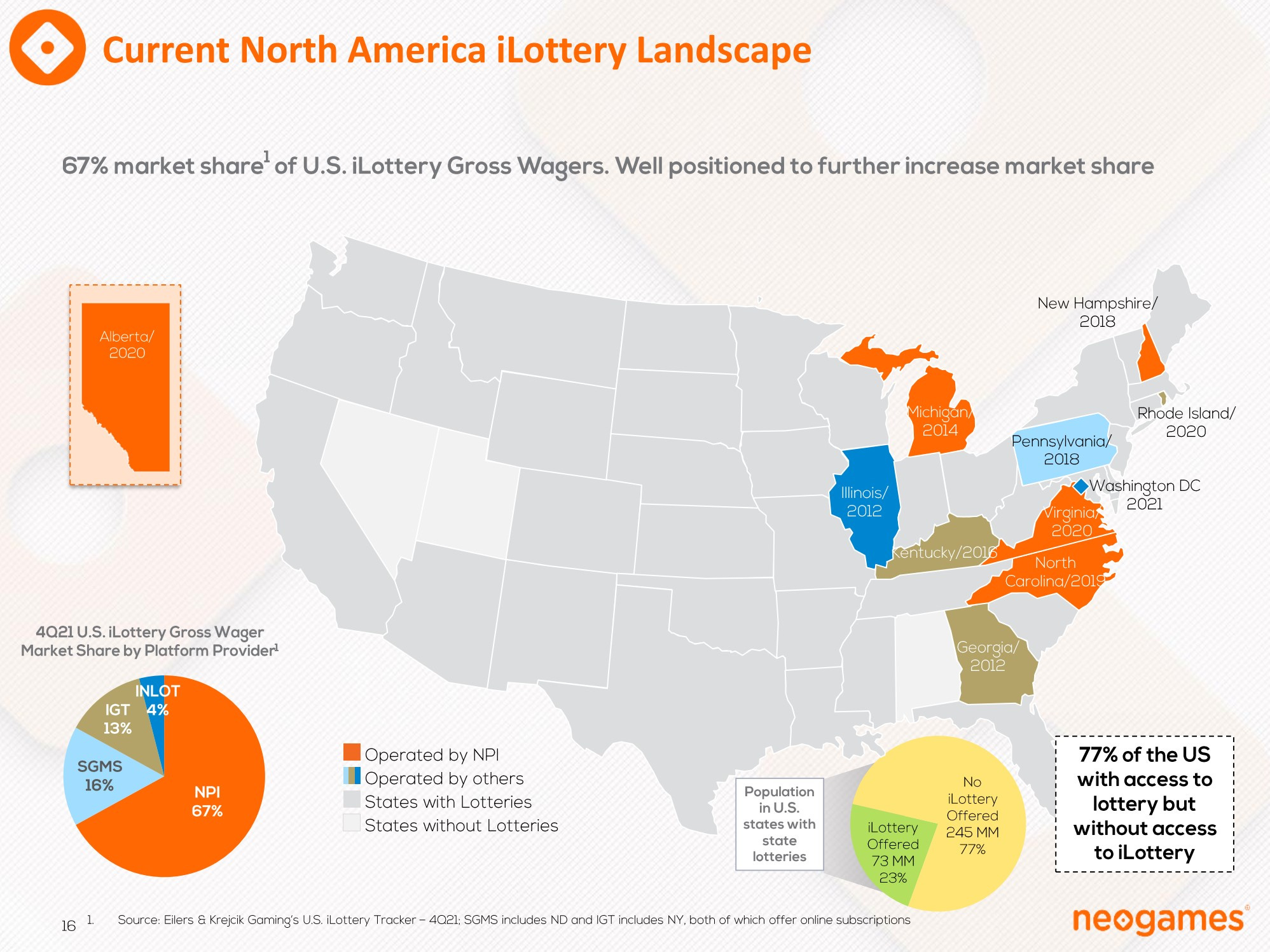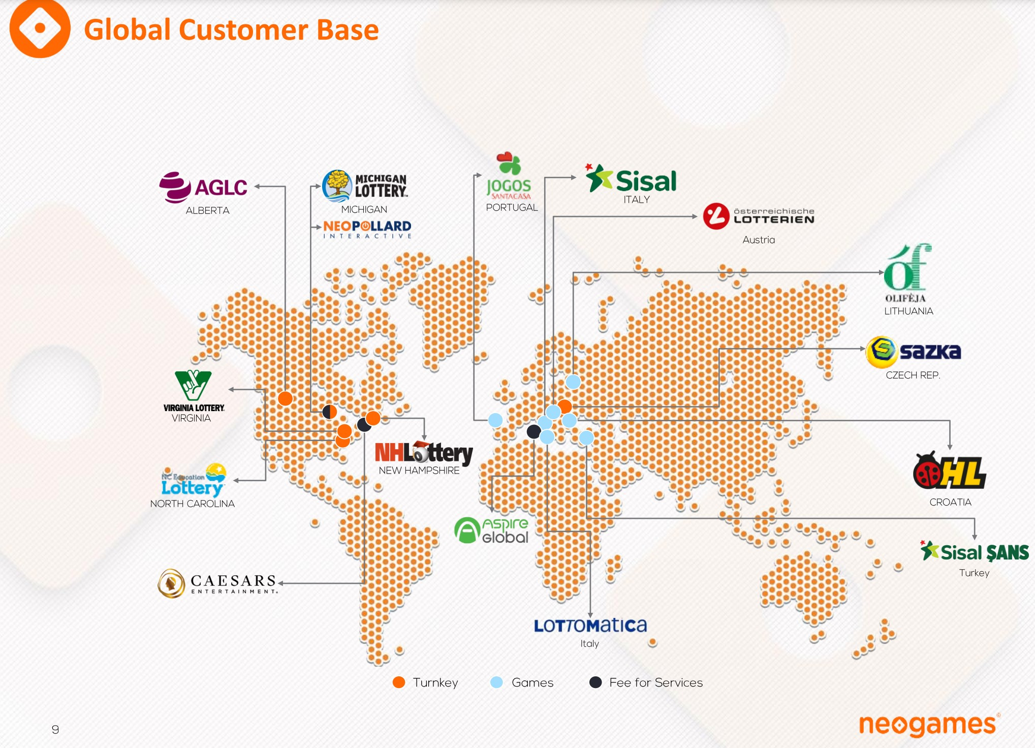 NeoGames began as a unit of Aspire Global (ASPIRE.ST) focusing on iLottery opportunities in Europe. NeoGames was spun off in 2014, two years after Illinois became the first U.S. state to offer iLottery products (instant and/or draw games offered via website/app).